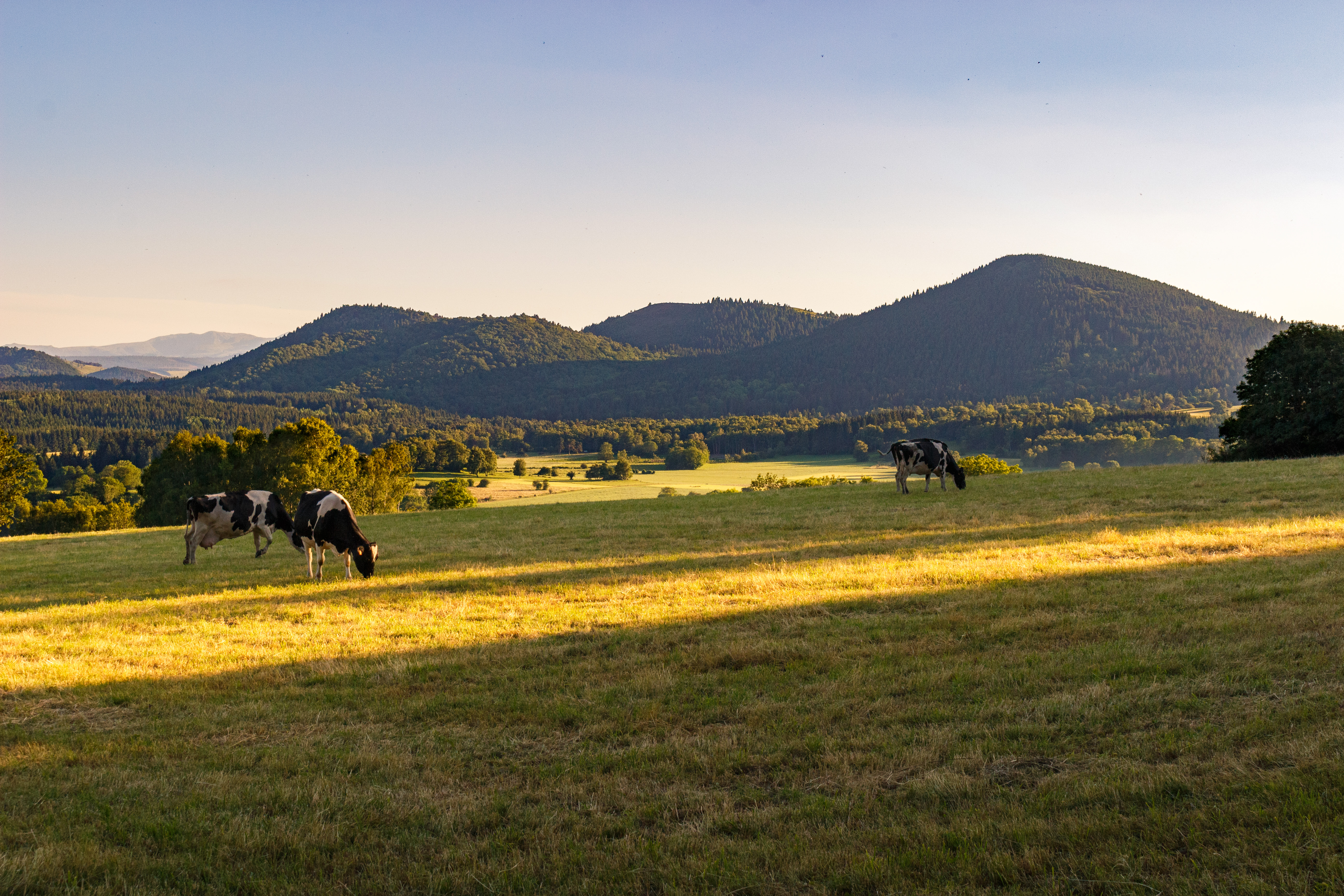 Un vache ruminant dans un pré avec vue sur le Sancy vers Fohet.